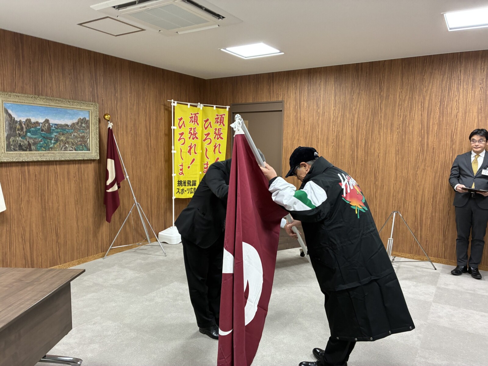 1月27日(火)広島県庁応接室で、第80回国民スポーツ大会冬季大会スキー競技会の広島県選手団団旗授与式が行われました。